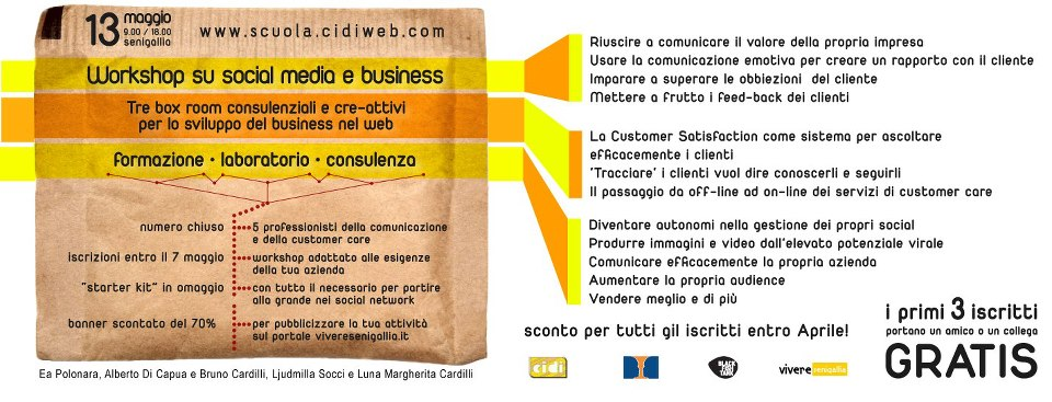 Al fine di un miglioramento complessivo della propria ‘visibilità social’ e quindi del proprio business, dopo l’entusiastica partecipazione ai due seminari di aprile, proponiamo per il 13 maggio, dalle 9,00 alle 18,00, c/o il CIDI di Senigallia, un workshop dal titolo “Workshop su Social Media e Business”. Tre box room consulenziali e cre-attivi per lo sviluppo del business nel web.