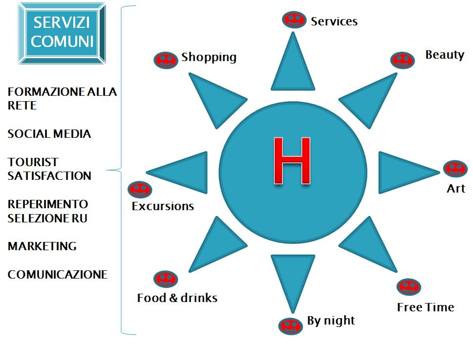 Il modello organizzativo proposto è quello di rete a ‘doppio legame’ (Forte/debole), che non ha nulla a che vedere con l’omonimo modello del sociologo M. Granovetter. Esso, infatti, poggia le sue basi da un lato sui legami (forti) delle strutture ricettive con talune tipologie di operatori (tipicità eno-gastronomiche, prodotti dell’artigianato locale, servizi di intrattenimento e di animazione, servizi per lo sport e il benessere, servizi per l’esplorazione del territorio, servizi balneari, e così via), in un rapporto di valorizzazione reciproca e di aumento della qualità dell’offerta nei confronti dei turisti che soggiornano presso le proprie strutture. Dall’altro, sull’esistenza di altri numerosi soggetti, fuori della rete (legami deboli), che mostrano interesse nel tempo di aderire al network, arricchendo la ‘proposta di valore’.
