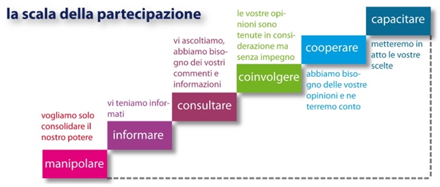 Premesso che la partecipazione ad una discussione, una decisione, una soluzione di un problema complesso che riguarda la propria città, oggi viene considerato un antidoto efficace per curare il senso di isolamento ed esclusione presente in larga parte della popolazione soprattutto giovanile – in sostanza la partecipazione strutturata e sistematica può favorire il risveglio di una comunità e contenere il dissenso civico. Tuttavia, ciò non sembra sia così semplice! La scala di Arnstein ci dà una mano quando stabilisce alcuni gradini dove la partecipazione può giocarsi a vario livello. Tolto il primo gradino (manipolare) che ha un sapore irritante per la comunità, cittadini e amministrazione possono concordare insieme quelle pratiche dove ci si ferma, da un lato, ad informare e consultare i cittadini su temi di una certa urgenza, dove le istituzioni pubbliche giocano un ruolo decisivo per la protezione e la sicurezza dei cittadini, il decoro e la mobilità urbana, la tassazione ed i servizi sociali sul territorio; dall’altro, quello di dare spazio alla voce dei cittadini, impegnandosi ad ascoltare, accogliere, e tenere in giusta considerazione i suggerimenti e le proposte. In sostanza, non tutto può essere oggetto di un processo partecipativo! Laddove ci siano le condizioni i cittadini vanno coinvolti ed ascoltati con delle regole d’ingaggio chiare e trasparenti.